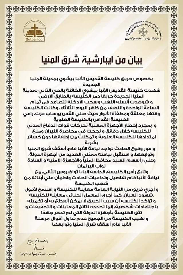 أصدرت إيبارشية شرق المنيا وتوابعها بيان بخصوص حريق كنيسة القديس الأنبا بيشوي بمدينة المنيا الجديدة.