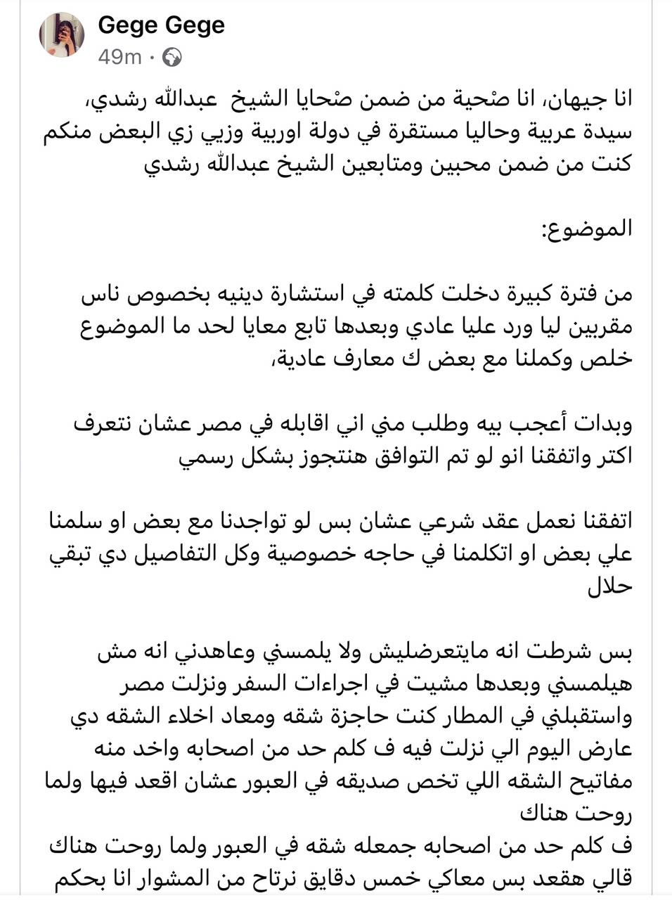 وسردت الفتاة الرواية قائلة،"انا جيهان، انا ضحية من ضمن صْحايا الشيخ عبدالله رشدي، سيدة عربية وحاليا مستقرة في دولة اوربية وزيي زي البعض منكم كنت من ضمن محبين ومتابعين الشيخ عبدالله رشدي من فترة كبيرة دخلت كلمته في استشارة دينيه بخصوص ناس مقربين ليا ورد عليا عادي وبعدها تابع معايا لحد ما الموضوع خلص وكملنا مع بعض ك معارف عادية".