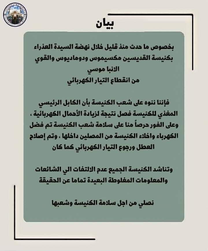 أصدرت بطريركية الآقباط الارثوذكس بالإسكندرية بيانا، أوضحت فيه سبب إخلاء كنيسة القديسين ماكسيموس وديماديوس والقوى الانبا موسى، وأشارت إلى أن الإخلاء جاء بسبب انقطاع التيار الكهربائى.