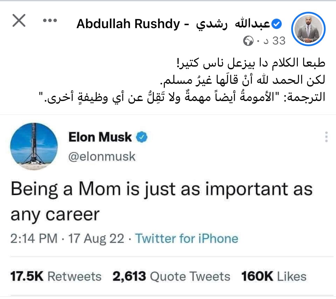 وقال "رشدي" عبر صفحته الرسمية بموقع التواصل الاجتماعي فيس بوك، طبعا الكلام دا بيزعل ناس كتير! لكن الحمد لله أنْ قالَها غيرُ مسلم. الترجمة: "الأمومةُ أيضاً مهمةٌ ولا تَقِلُّ عن أي وظيفةٍ أخرى."