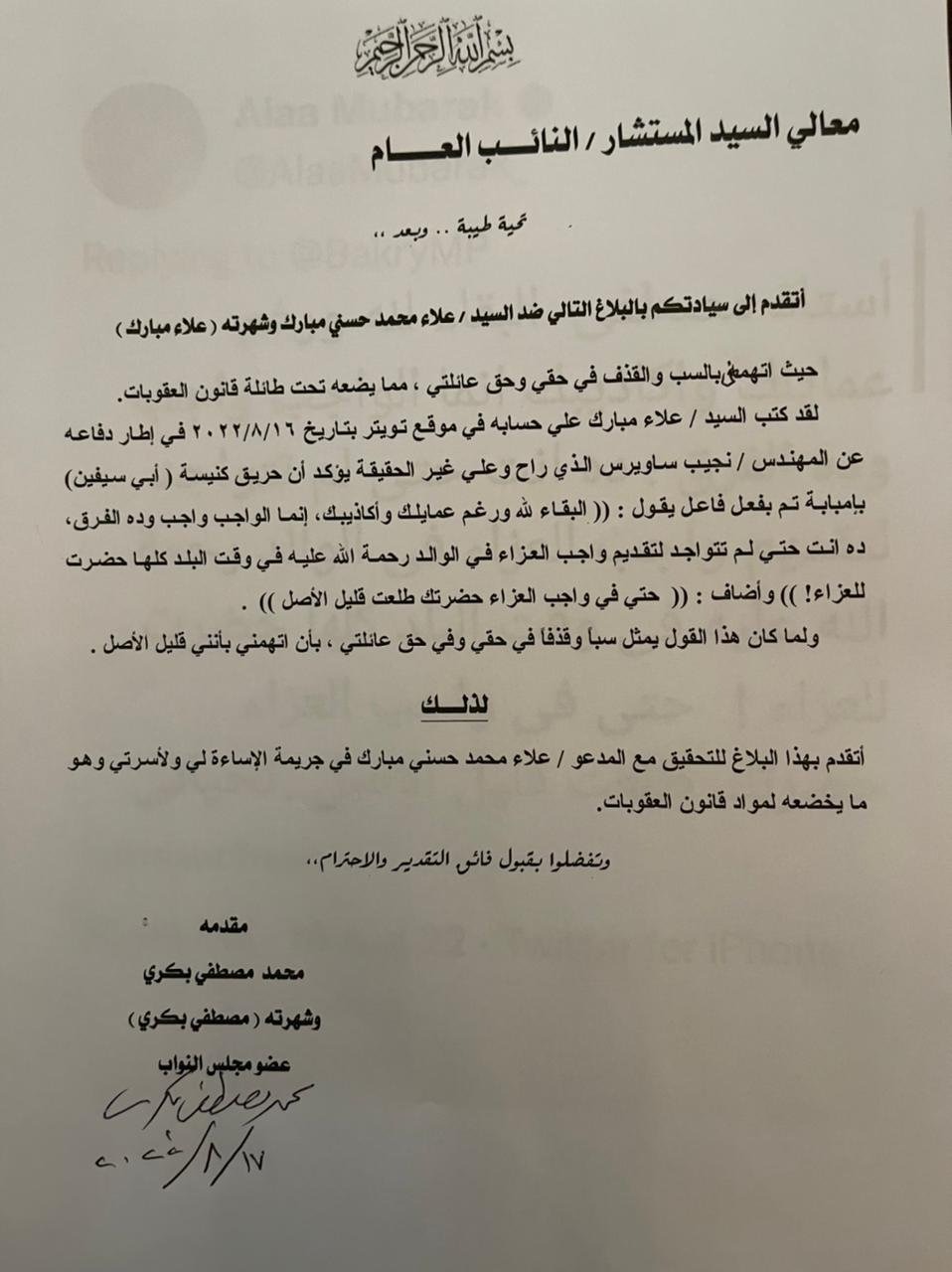 تقدم الكاتب الصحفي، مصطفى بكرى، عضو مجلس النواب، ببلاغ إلى النائب العام، ضد علاء مبارك، نجل الرئيس الراحل حسني مبارك، اتهمه فيه بالسب في حقه وحق أسرته مما يشكل جريمة يعاقب عليها قانون العقوبات.