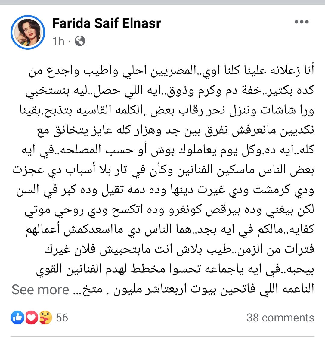 علقت فريدة سيف النصر قائلة:"أنا زعلانة علينا كلنا أوي..المصريين أحلي وأطيب وأجدع من كده بكتير..خفة دم وكرم وذوق..إيه اللي حصل..ليه بنستخبي ورا شاشات وننزل نحر رقاب بعض الكلمة القاسية بتذبح.. بقينا نكديين مانعرفش نفرق بين جد وهزار كله عايز يتخانق مع كله..ايه ده".