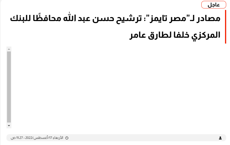 وكشفت مصادر لـ" مصر تايمز" في وقت سابق، عن ترشيح حسن عبد الله رئيس الشركة المتحدة للخدمات الإعلامية لتولي منصب محافظ البنك المركزي خلفا لطارق عامر الذي قدم اعتذارًا أمس ، وذلك للخلفية الاقتصادية الكبيرة التي يتمتع بها حسن عبد الله.
