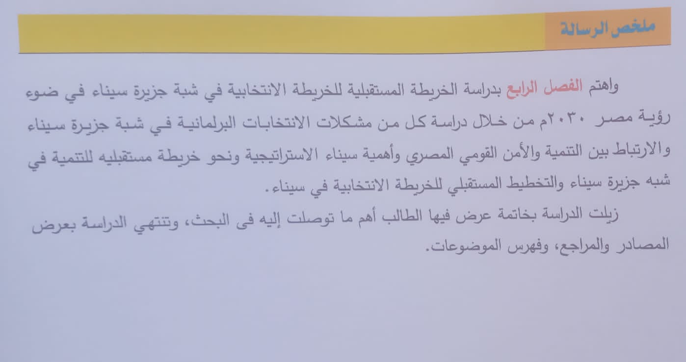 وتتناول الرسالة المتغيرات المكانية والسكانية والطبيعية ونشاط السكان وظروف بيئتهم، وما تعرضو له قبل 2013، ونجاح الدولة في ضبط هذه البيئة ومنح المواطن حرياته الكاملة، بداية من ترسيم الدوائر على أسس الحق الكامل للجميع، حيث تناولت شبه جزيرة سيناء، تحت عنوان: الدوائر الانتخابية في شبه جزيرة سيناء - دراسة في ةلجغرافيا السياسية .. للباحث إسماعيل رفعت إبراهيم إسماعيل ، يناقشها معهد البحوث والدراسات العربية التابع للمنظمة العربية للتربية والثقافة والعلوم ( ألسكو )، في الحادية عشرة من صباح الثلاثاء 23 أغسطس 2022.
