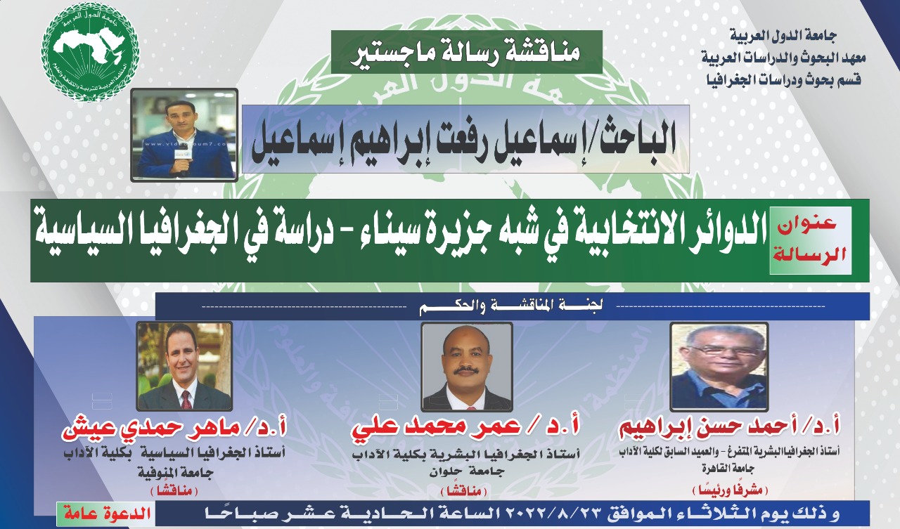 تناقش لجنة التحكيم والمناقشة رسالة ماجستير في الدراسات الجيوسياسية مقدمة من الصحفي و الباحث إسماعيل رفعت الصحفي بمؤسسة وجريدة اليوم السابع، كأول رسالة علمية لتشكيل الدوائر الانتخابية البرلمانية بعد 2013 على أسس سياسية تمنع الجماعات من التلاعب بالدولة.