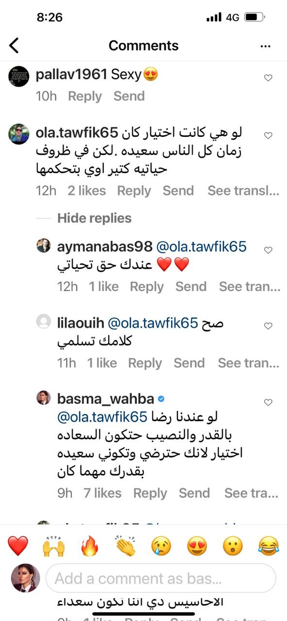 وفسر البعض، في التعليقات على أن بسمة وهبة تعيش حاله من السعادة، لقرارها انها لن تركز فيما تعانيه من مرض بمعدتها والتي ستخضع بسببه لعمليه جراحية أخرى الشهر القادم.