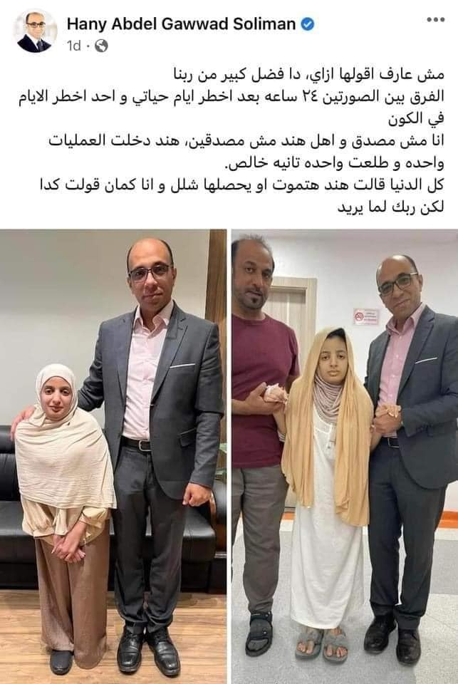 تصدر الدكتور هانى عبد الجواد ، الأستاذ المساعد في كلية الطب- جامعة الأزهر السوشيال ميديا بعد نجاحه فى إجراء عملية جراحية نادرة لفتاة إماراتية لإصلاح اعوجاج وتحدب شديد في عمودها الفقري بعد أن فقد أهلها الأمل فى شفائها.