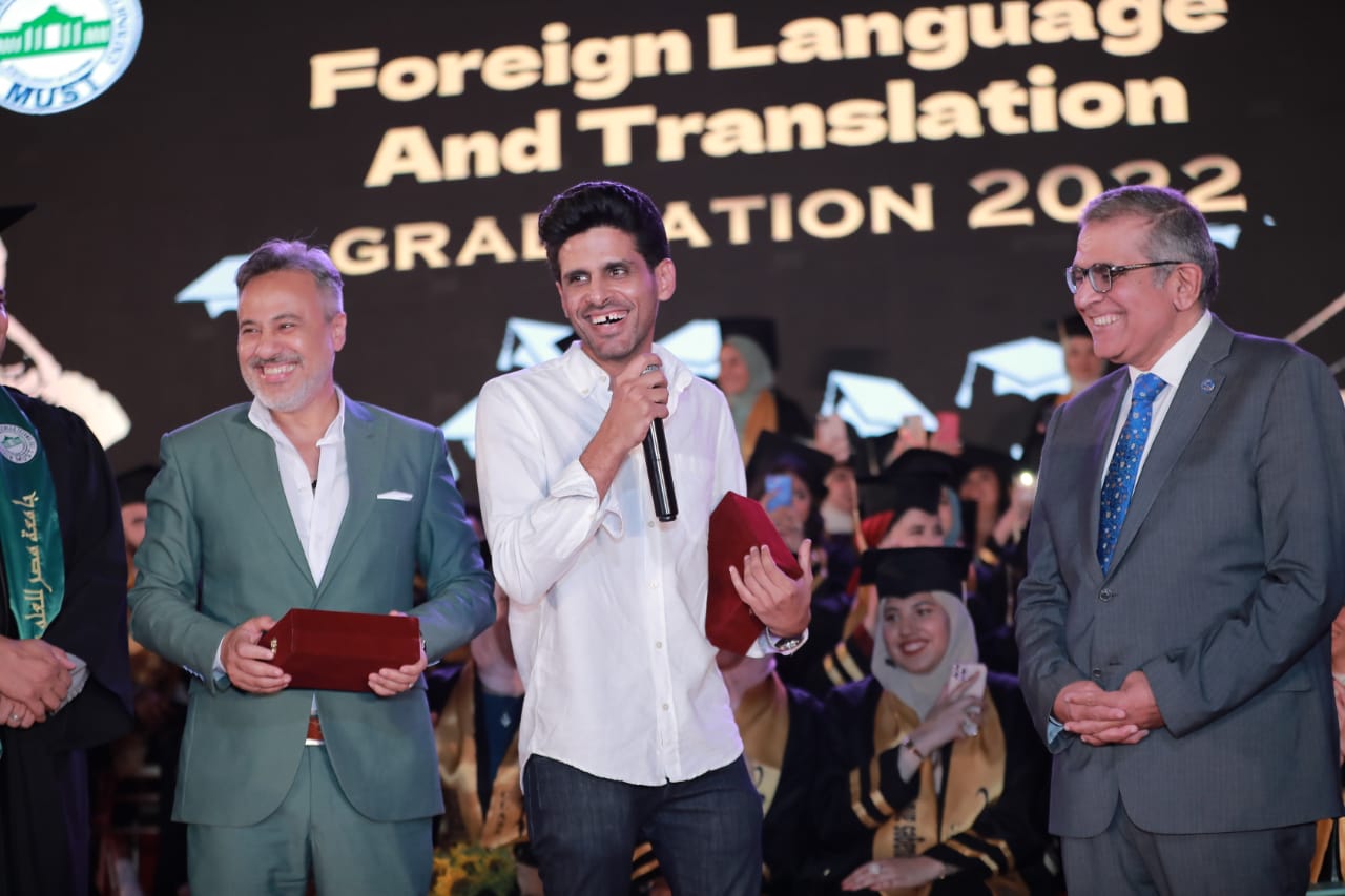 وعلى هامش الحفل الكبير كرمت جامعة مصر للعلوم والتكنولوجيا الفنان إيهاب فهمى، والفنان حمدى الميرغنى، وأعرب فهمى عن سعادته بحضور حفل التكريم وسط الخريجين مشيداً بجامعة مصر للعلوم والتكنولوجيا وبمستوى الطلاب، كما عبر الميرغني عن فخره بالوقوف على مسرح أوبرا جامعة مصر، موضحاً إنه سعيد للغاية بتواجده فى صرح تعليمي عملاق ووسط الطلاب وأولياء الأمور.