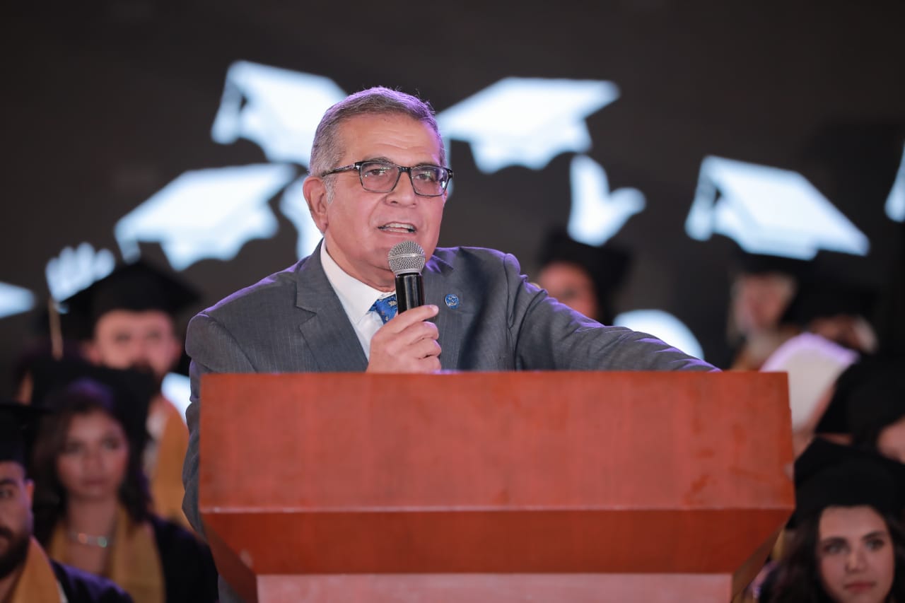 وحرص د. حيدر على تهنئة الطلاب وأولياء الأمور، كما وجه الشكر والتحية لأعضاء هيئة التدريس الذين كانوا بمثابة أولياء أمور لجميع الطلاب خلال فترة دراستهم، مشيراً إلى أن خالد الطوخي رئيس مجلس الأمناء أكد أن تكون حفلات التخرج هذا العام على أعلى مستوى، وأضاف :"كلية اللغات الترجمة تعد من اوائل الكليات المنشأة في الجامعة التي انشأتها الدكتورة سعاد كفافي التي أمنت بالثقافة والعلم وتخصص اللغات والترجمة، مشيرا إلى أنه تم اضافة قسم اللغة الروسية لتبدأ من العام القادم، وفي اطار التطوير والتحول الرقمي الفعلي لتحقيق اهداف استراتيجية الدولة 2030، سيتم نقل الكلية لامتداد الجامعة الجديد داخل التوسعات، فلابد للبدء على العمل على علاقة التكنولوجيا مع اللغات والترجمة ويجب التسلح بتلك البرامج ليكون لكم مكانة في سوق العمل".