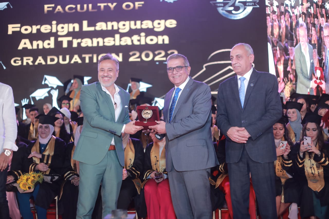 ورحب د. أشرف حيدر بضيوف الحفل، ومنهم الفنان إيهاب فهمى، والفنان حمدى الميرغنى الذين حرصوا على حضور الحفل من أجل مشاركة الطلاب فرحتهم بعد الانتهاء من مشوارهم التعليمي والاستعداد لخوض تجارب الحياة العملية متسلحين بالعلم والانطلاق لسوق العمل، متسلحين بأحدث الأساليب العملية الحديثة والبرامج الحديثة في مجال الترجمة الفورية واللغات المتعددة".