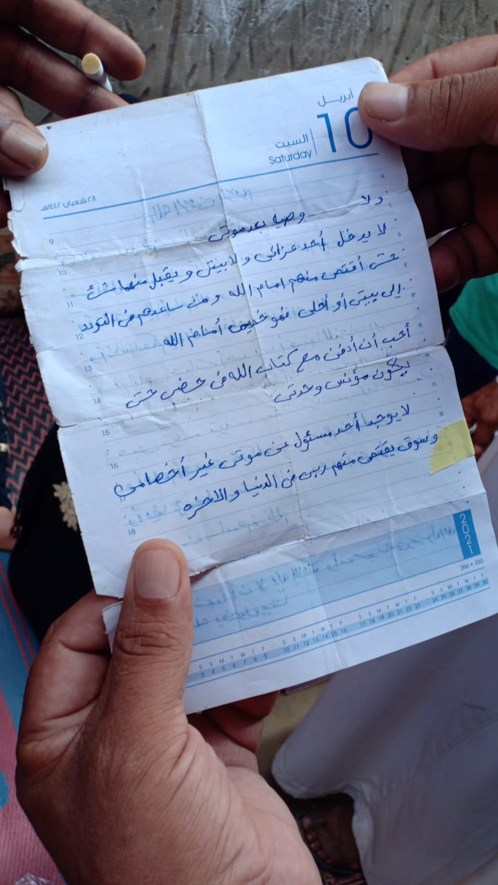 وأضاف: "حسني بركات، رمضان سلامة، هاني، وأهاليهم أجمعين وكل من ساعد في ظلمي، وأيضا مصطفى شيخ البلد، وكل من ساعد في ظلمي، أشهد أن لا إله إلا الله وأن سيدنا محمد رسول الله