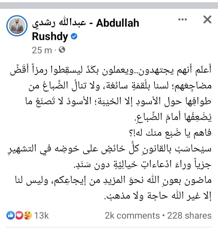وقال عبد الله رشدى ،" أعلم أنهم يجتهدون..ويعملون بكَدٍّ ليسقِطوا رمزاً أقَضَّ مضاجِعَهم؛ لسنا بلُقمَةٍ سائغة، ولا تنالُ الضِّباعُ من طوافِها حول الأسودِ إلا الخيْبَة؛ الأسودُ لا تَصنَعُ ما يُضْعِفُها أمامَ الضِّباعِ..فاهم يا ضَبْع منك له!؟سيُحاسَبُ بالقانونِ كلُّ خائضٍ على خوضِه في التشهيرِ جرْياً وراءَ ادَّعاءاتٍ خيالِيَّةٍ دون سَنَدٍ..ماضون بعونِ الله نحوَ المزيدِ من إيجاعِكم، وليس لنا إلى غير الله حاجة ولا مذهبُ".