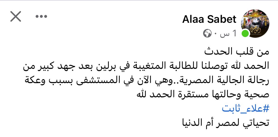 بعد اعلان تغيب طالبة مصرية في العاصمة الألمانية برلين، عبر موقع التواصل الاجتماعي تم العثور عليها في احد مستشفيات برلين، اعلن علاء ثابت رئيس بيت العائلة المصرية في المانيا، عبرموقع التوصل الاجتماعي فيس بوك، العثور علي الفتاة المصرية المختفية، والتى أثير الحديث عن اختفاؤها منذ صباح اليوم.