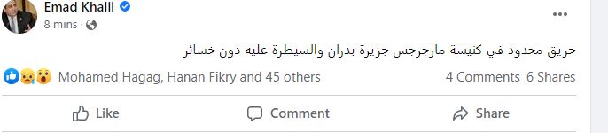 أعلن منذ قليل النائب عماد خليل عضو مجلس النواب عن تنسيقية شباب الأحزاب والسياسيين عن نشوب حريق محدود في كنيسة مارجرجس جزيرة بدران، بمنطقة شبرا مصر.
