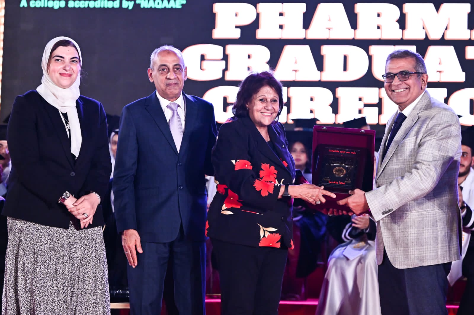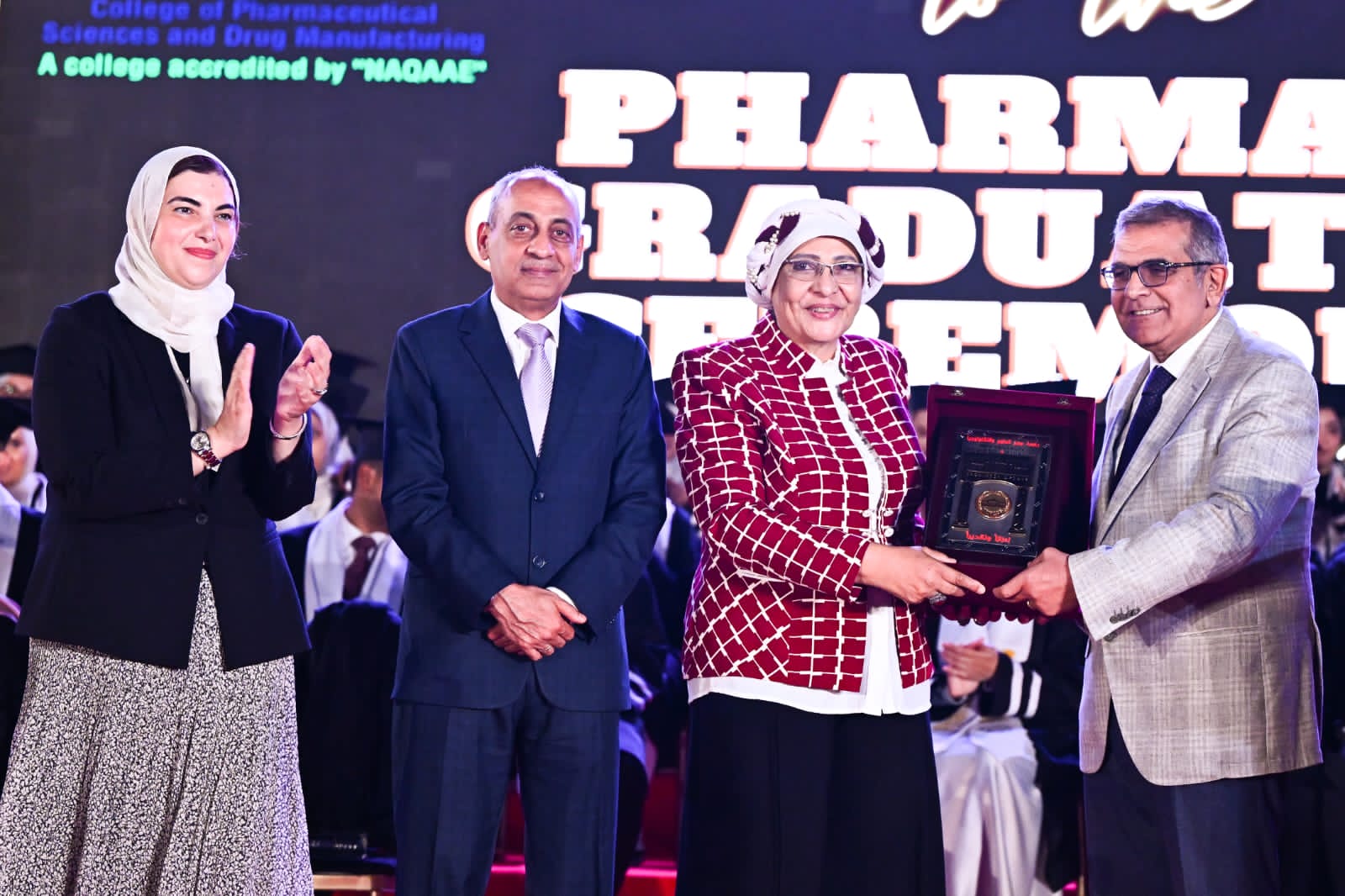 فيما قدمت الدكتورة رحاب عبدالمنعم، القائم بأعمال عميد كلية الصيدلة جامعة مصر للعلوم والتكنولوجيا، التحية لضيوف الحفل، كما هنأت الطلاب وأولياء أمورهم على التخرج والاستعداد لخوض الحياة العملية بعد أن تم تأهيلهم على أعلى مستوى داخل الكلية من خلال توفير كل الدعم لهم من برامج اكلينيكية تواكب العصر الحديث في علوم الصيدلة والعلوم الصيدلية تساعد الطلاب على التسلح بكل ما هو جديد في المجالات الطبية الصيدلية، وتعتبر كلية العلوم الصيدلية والتصنيع الدوائي من أكبر وأقدم الكليات التي تضمها جامعة مصر للعلوم والتكنولوجيا حيث أنشأت بموجب قرار رئيس جمهورية مصر العربية رقم 245 لسنة 1996، وقد استوفت الكلية المعايير القومية القياسية لذا تم اعتماد الكلية من قبل الهيئة القومية لضمان جودة التعليم والاعتماد، وتوفر الكلية مناخ يضمن تقديم صيدلي متميز حيث أن دور الصيدلي في مجال الرعاية الصحية وفقًا للمعايير العالمية يتعاظم يومًا بعد يوم حيث تلتزم الكلية في رسالتها بتخريج صيدلي طبقًا للمعايير القومية الأكاديمية المرجعية القياسية يلبي احتياجات سوق العمل المحلي والإقليمى والتصنيع الدوائي المتطور وإجراء بحوث علمية مبتكرة بداية من البحث عن الأدوية الحديثة من أصل نباتي أو حيواني أو تلك التي يتم تشييدها معمليًا.