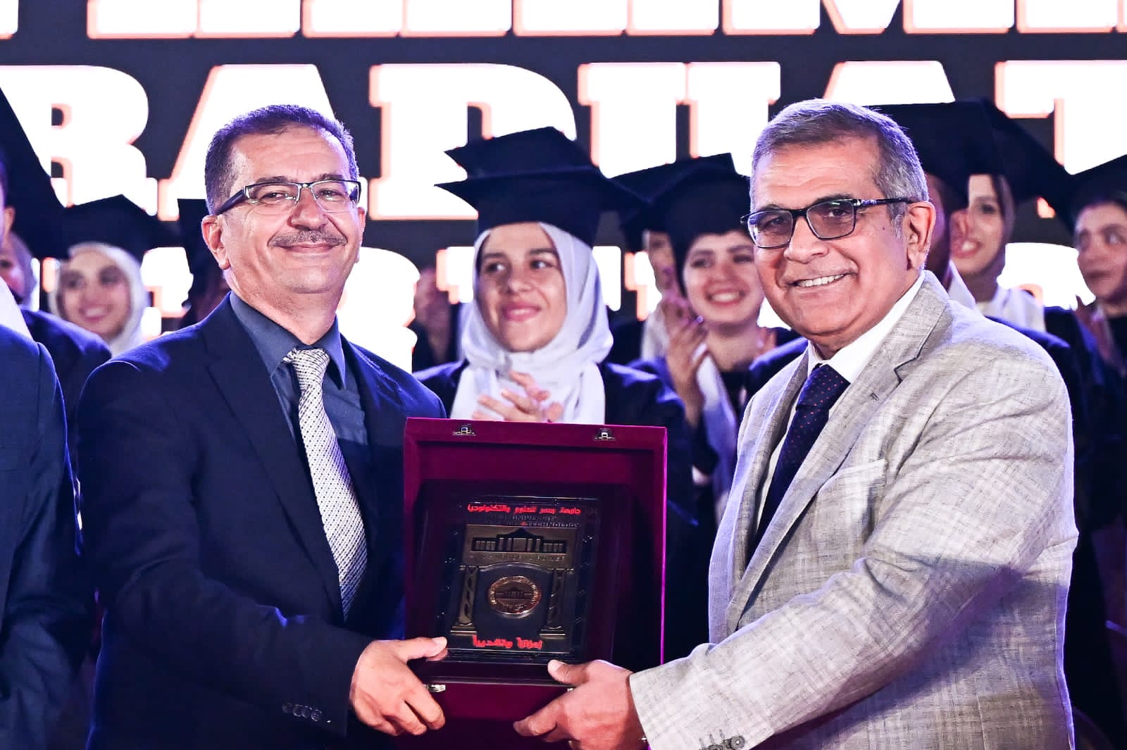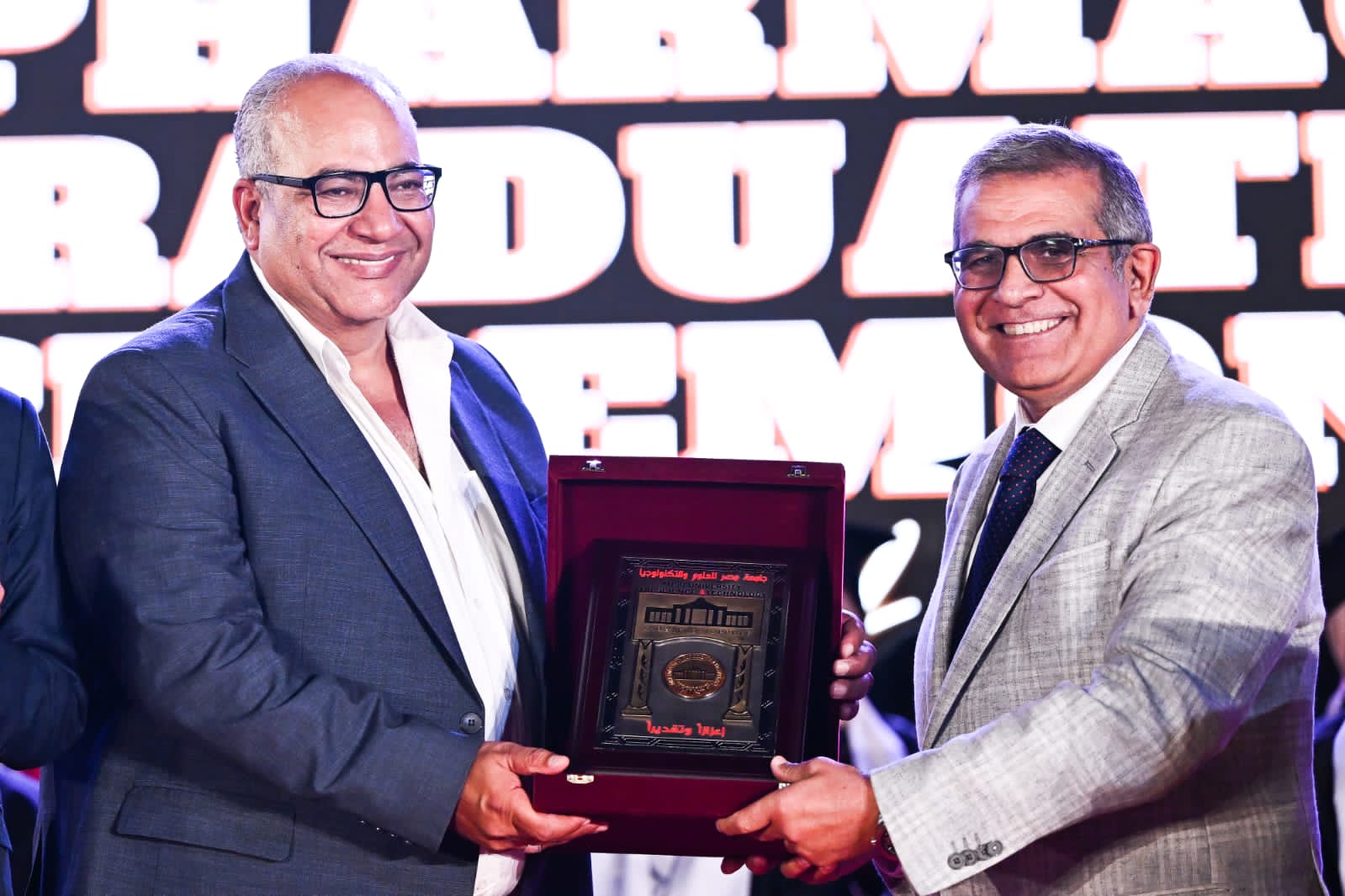 وعلى هامش الحفل كرمت جامعة مصر للعلوم والتكنولوجيا، كل من الفنان الكبير بيومي فؤاد، الذي طالب الطلاب بانتظار شخصية الدكتور ربيع في مسلسل الكبير اوي رمضان المقبل، والنجم محمود عبدالمغني، الذي هنأ الطلاب وطالبهم بتقديم التحية للأهالي مطالبهم بجبر خواطر الناس، مشدداً على فخره واعتزازه بتكريمه من جامعة مصر للعلوم والتكنولوجيا التى تعد من أوائل وأقدم الجامعات الخاصة فى مصر، وتم تكريم الدكتورة فوزية ابو الفتوح نائب رئيس الجامعة لشئون الدراسات العليا، والدكتور وائل توكل نائب رئيس الجامعة لشئون التعليم والطلاب السابق، والدكتورة حنان الرفاعي عميدة الكلية الصيدلة السابقة، الدكتور محي حافظ عضو مجلس الشيوخ، والدكتورة نجوى هاشم نقيب صيادلة الجيزة.