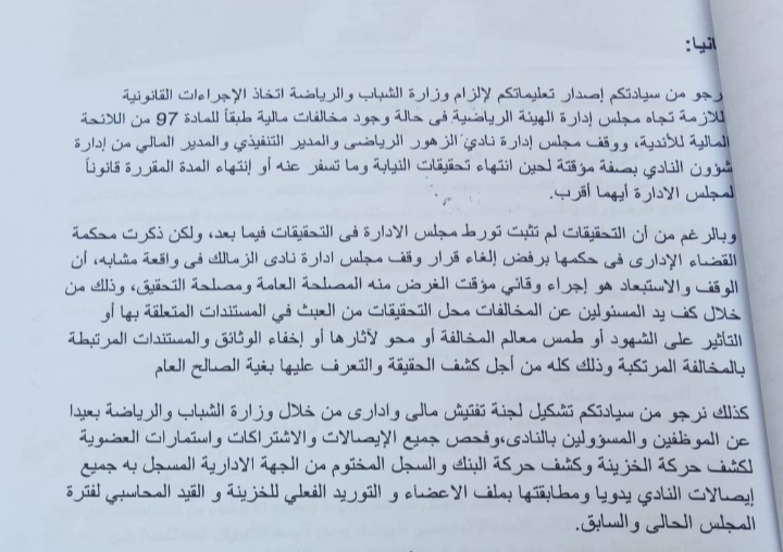 كما طالبوا بتشكيل لجنة تفتيش مالي وإداري من خلال وزارة الشباب والرياضة بعيدًا عن الموظفين والمسؤولين بالنادي وفحص جميع الإيصالات والإشتراكات واستمارات العضوية لكشف حركة الخزينة وكشف حركة البنك والسجل المختوم من الجهة الادراية المسجل به جميع ايصالات النادي يدويا ومطابقتها بملف الاعضاء والتوريد الفعلي للخزينة والقيد المحاسبي لفترة المجلس الحالي والسابق .