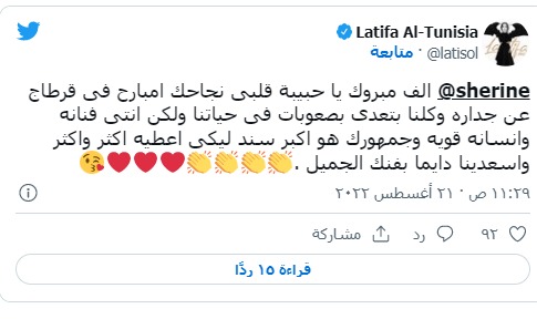 وكتبت لطيفة على موقع التدوينات القصيرة "تويتر" مغردة:" ألف مبروك يا حبيبة قلبى نجاحك إمبارح فى قرطاج عن جداره وكلنا بنعدى بصعوبات فى حياتنا ولكن إنتى فنانة وإنسانة قوية وجمهورك هو أكبر سند ليكى أعطيه أكثر وأكثر وأسعدينا دايما بفنك الجميل".