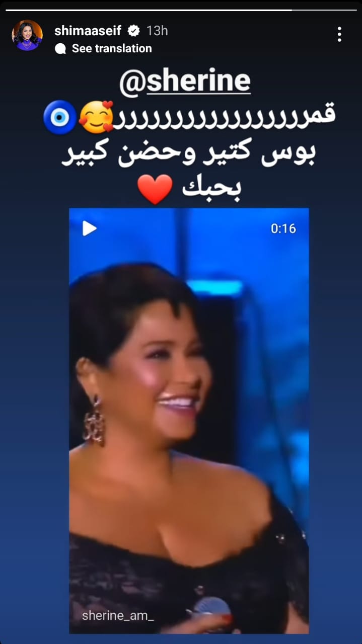 نشرت شيماء سيف على موقع تبادل الصور والفيديوهات “إنستجرام” جزء من حفل شيرين عبدالوهاب وعلقت عليها :" قمررر بوس كتير وحضن كبير ..بحبك".