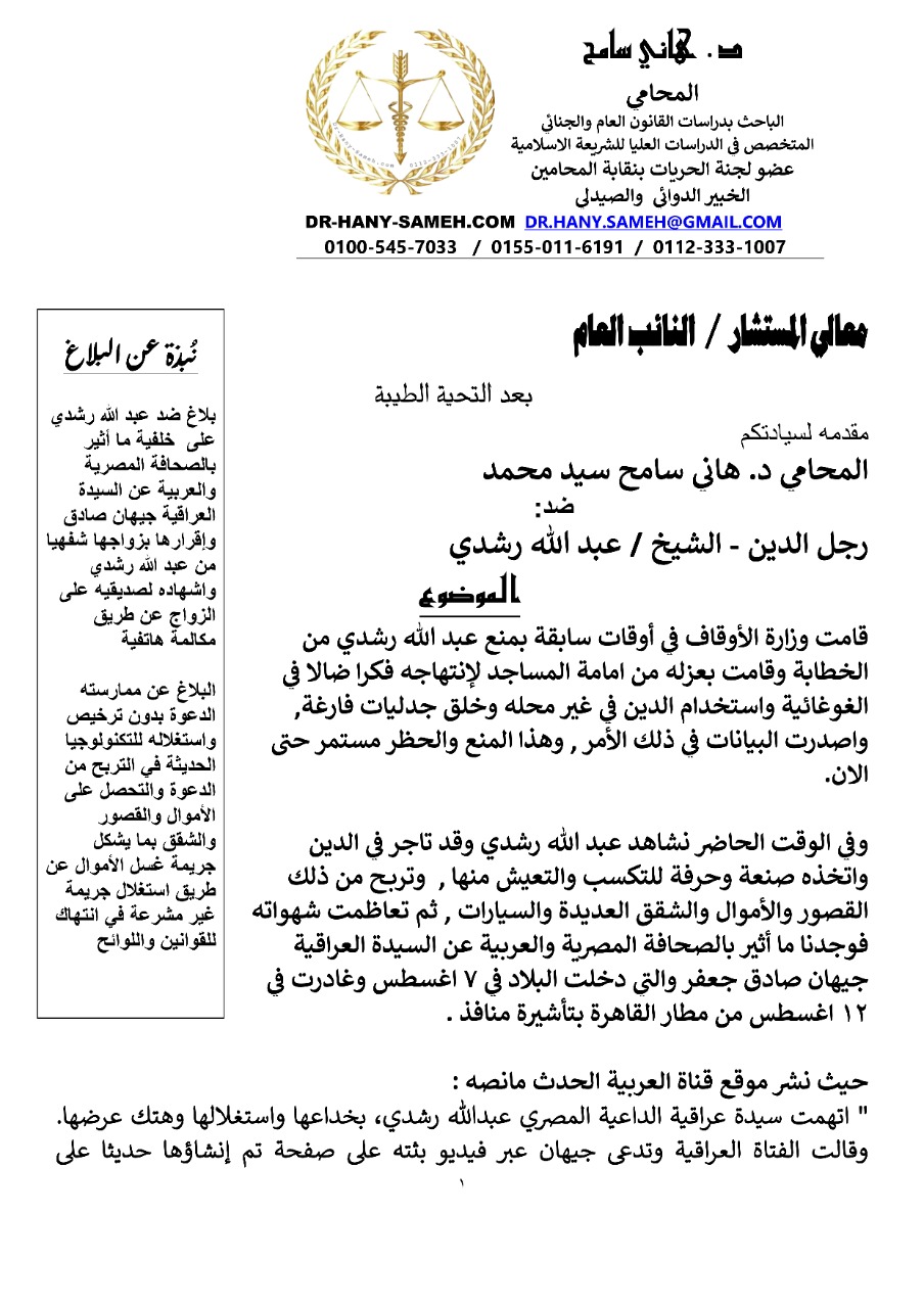وقال في البلاغ أنه في الوقت الحاضر يشاهد المجتمع عبد الله رشدي وقد تاجر في الدين واتخذه صنعة وحرفة للتكسب والتعيش منها , وتربح من ذلك القصور والأموال والشقق العديدة والسيارات , ثم تعاظمت شهواته فوجدنا ما أثير بالصحافة المصرية والعربية عن السيدة العراقية جيهان صادق جعفر والتي دخلت البلاد في 7 اغسطس وغادرت في 12 اغسطس من مطار القاهرة بتأشيرة منافذ .