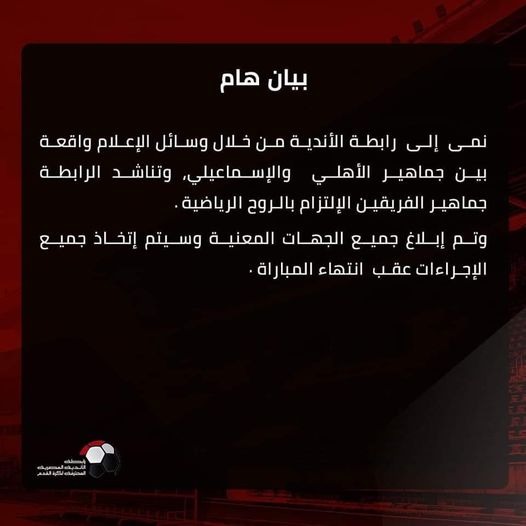 وقالت الرابطة خلال البيان أنه نمى إلى علمها، من خلال وسائل الإعلام، واقعة بين جماهير النادي الأهلى والنادي الإسماعيلي، مناشدة جماهير الناديين الالتزام بالروح الرياضية.