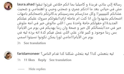 عاتبت الفنانة لورا عبد الأحد زوجة الفنان شريف منير الثانية ابنتيها منه فريدة وكاميليا، بعدما ظهرتا معه في مقطع فيديو أثناء تناول الطعام بأحد المطاعم.