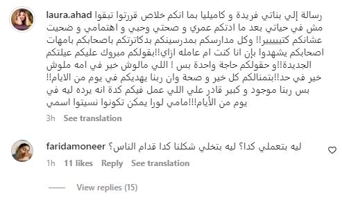 ونشرت لورا فيديو على صفحتها الشخصية بإنستجرام يظهر فيه ابنتيها صحبة والدهما أثنا تناولهم الطعام، في أحد المطاعم وكتب تقول: "رسالة إلى بناتي فريدة وكاميليا.. بما إنكم خلاص قررتوا تبقوا مش في حياتي بعد ما اديتكم عمري وصحتي وحبي واهتمامي وضحيت عشانكم كتير!! وكل مدارسكم بمدرسينكم بدكاترتكم بأصحابكم بأمهات أصحابكم يشهدوا بإن أنا كنت أم عاملة إزاي!"