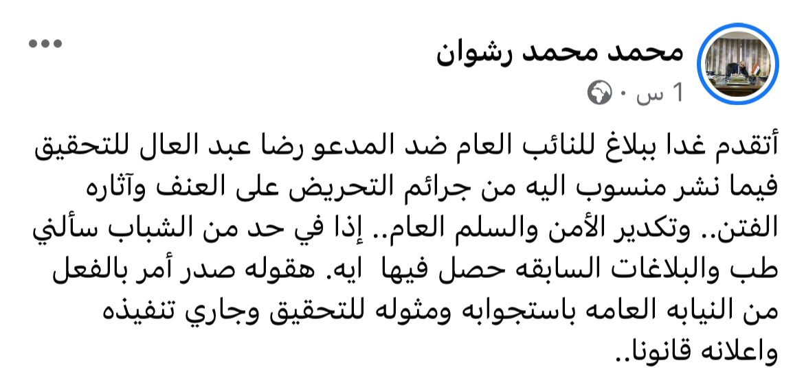 أعلن محمد محمد رشوان المحامي، اعتزامه التقدم ببلاغ ضد رضا عبد العال للتحقيق فيما نشر منسوب اليه من جرائم التحريض على العنف وآثاره الفتن وتكدير الأمن والسلم العام.