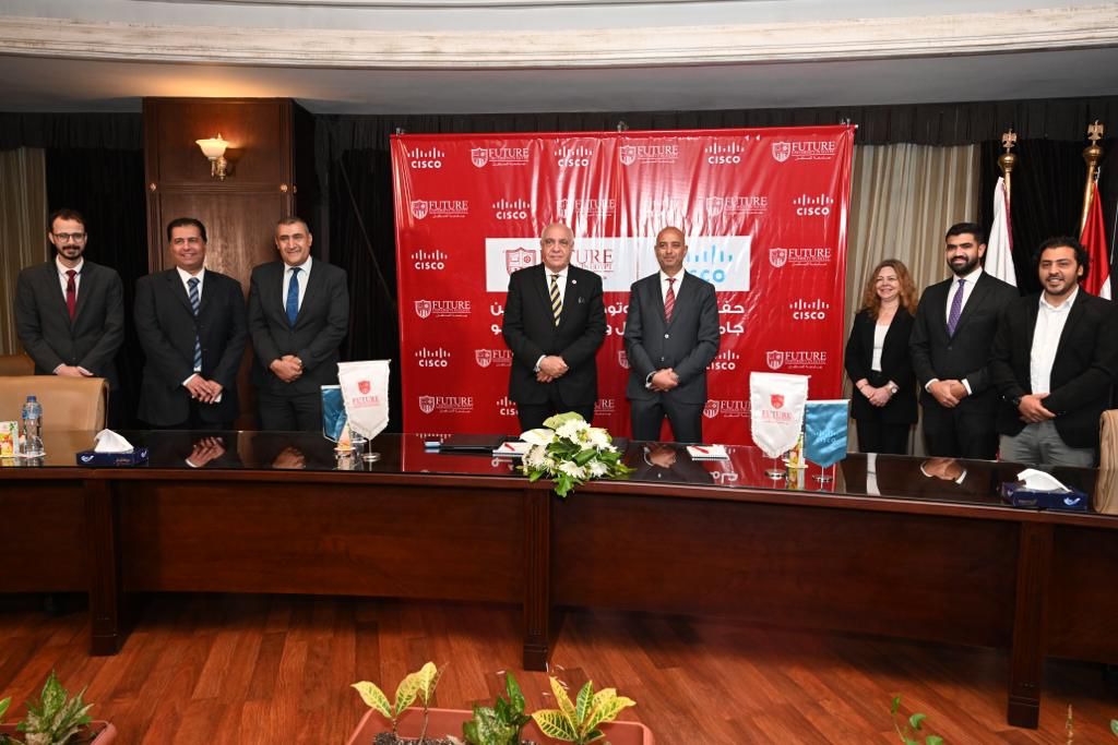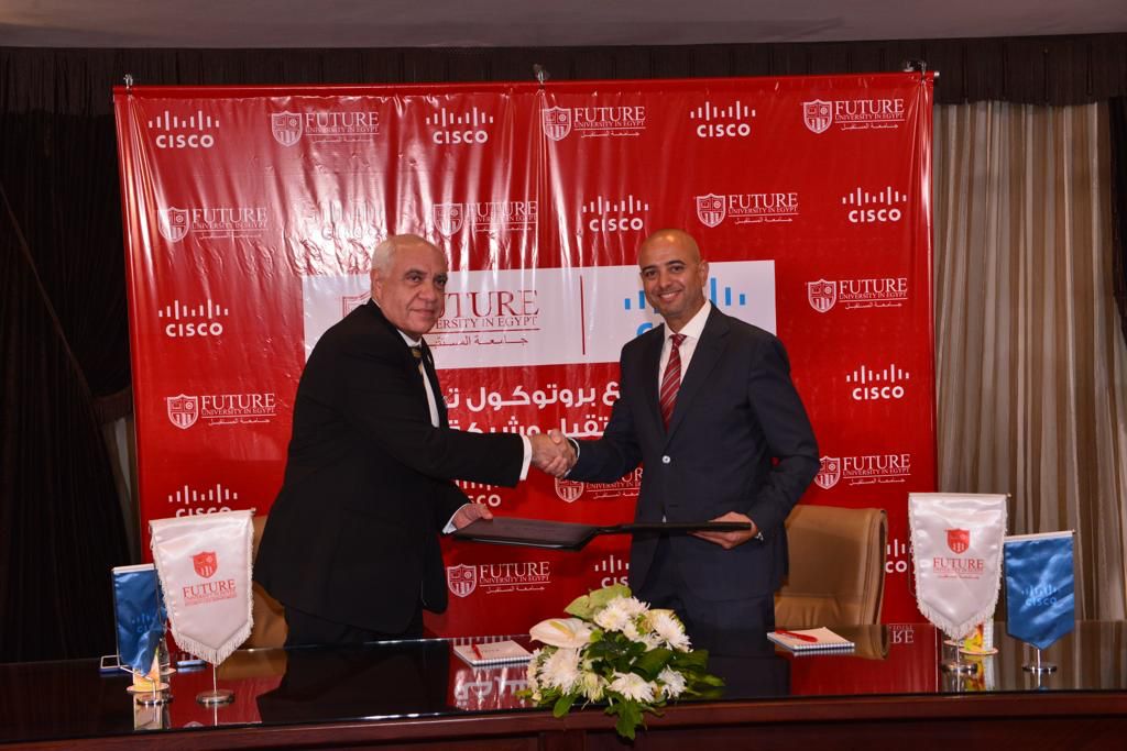 تاكيدا على أهمية دور جامعة المستقبل ، في إتاحة تعليم متميز من خلال تقديم برامج تعليمية متطورة تلبي متطلبات سوق العمل المحلي والإقليمي والدولي. وقعت جامعةالمستقبل بروتوكول تعاون مع كبرى الشركات العالمي وهى شركة سيسكو العالميةCISCOلتكون الجامعه واحدة من بيوت الخبرة العالميه وتوفير فرص تدريب على أعلى مستوى لطلاب الجمعه تم توقيع البروتوكول بحضور الدكتور خالد العزازى رئيس مجلس الأمناء والمؤسس الاول الجامعة