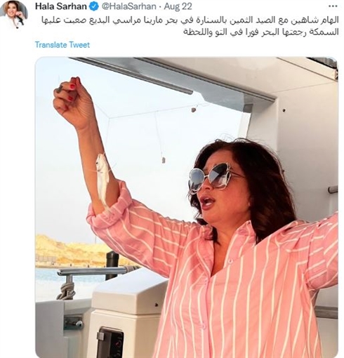 وأوضحت: "إلهام شاهين مع الصيد الثمين بالسنارة في بحر مارينا مراسي البديع، صعبت عليها السمكة رجعتها البحر فورا في التو واللحظة".