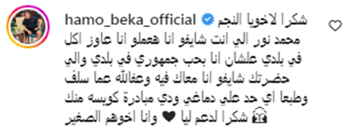 وكتب محمد نور تعليق على الفيديو الذي نشره: " لكل أعضاء نقابة المهن الموسيقية أخوتنا الكبار اللي طول عمرهم معانا في كل كبيرة وصغيرة بعتذرلكم نيابة عن حمو بيكا هو أكيد مكنش يقصد الإنسان وقت الغضب مش بيعرف يقول ايه هو بس عاوز يشتغل ودي كلمة اثرت فيا طبعا ولكن. ده ميديلوش أي حق ان يغلط في اي حد من اساتذتنا الكبار هو هيعتذر وعشان خاطري أنا تقبلو اعتذاره أنا هجيبو وأجيلكم ونخلص الموضوع وتشغل إن شاء اللهً أتمني تقرأ الكلام ده وتعتذر وهما مفيش أطيب منهم والموضوع يخلص أنا بس تدخلت عشان عارف أنك طيب وفي حالك وعندك جمهور بيحبك وهما محترمين فوق الوصف أهل وعيله حقيقي مش نقابة، وعفا اللهً عما سلف شكرا وأتمني من الجميع محدش يغلظ أو كده في الكومنتات أنا فقط مقدرتش اسمع حد بيقول نفسي اشتغل وانا محاولش أساعد شكرا للجميع طولت عليكم شكرا لأستاذ أحمد رمضان والمايسترو الأستاذ حمادة أبوً اليزيد وأنا متاكد أنكم هتتعاونو معايا وده مش جديد عليكم.