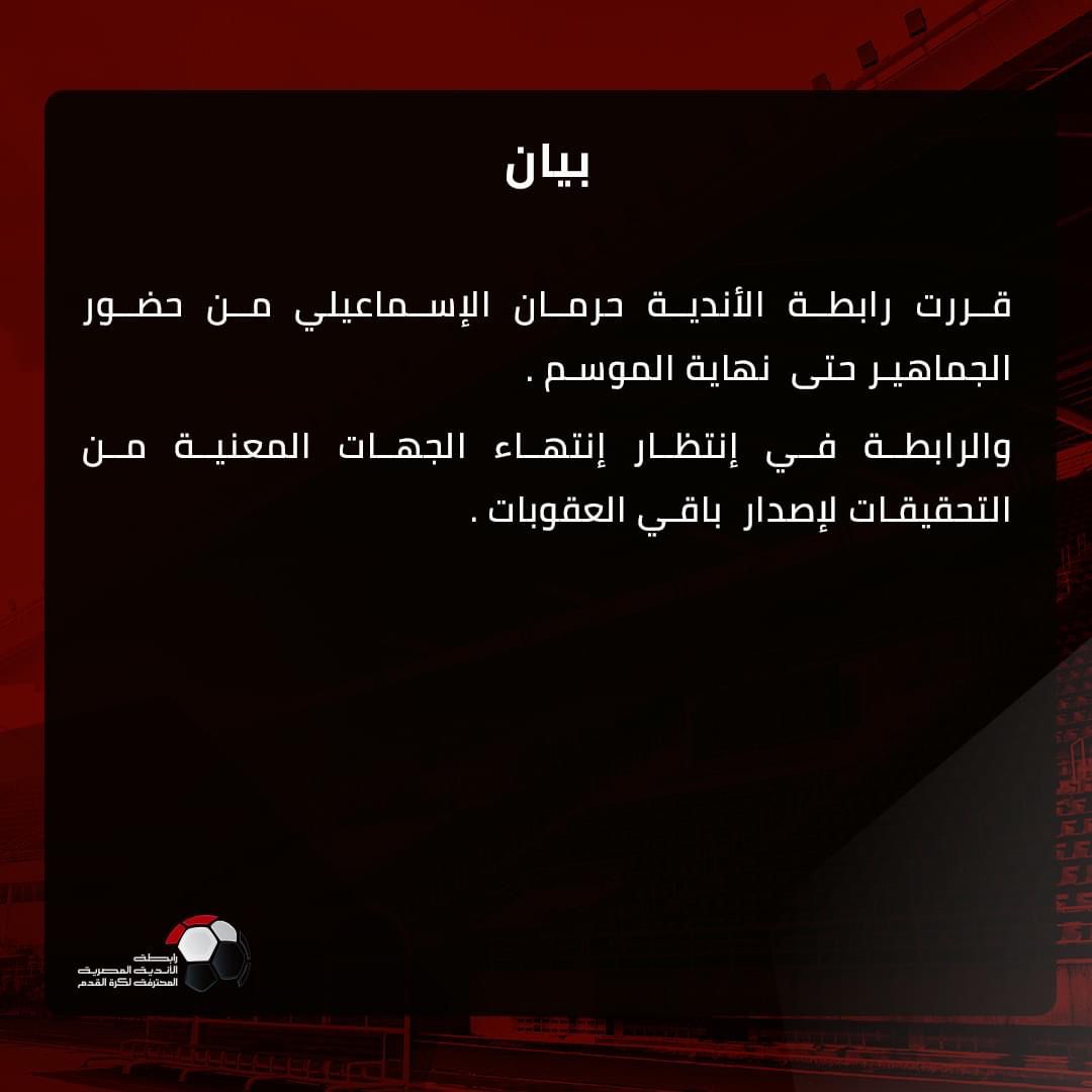 ونشرت رابطة الأندية المصرية بيانًا رسميًا عبر حسابهم الرسمي على موقع التواصل الاجتماعي تويتر، ينص على: قررت رابطة الأندية حرمان الإسماعيلي من حضور الجماهير حتى نهاية الموسم، والرابطة في انتظار انتهاء الجهات المعينة من التحقيقات لإصدار باقي العقوبات