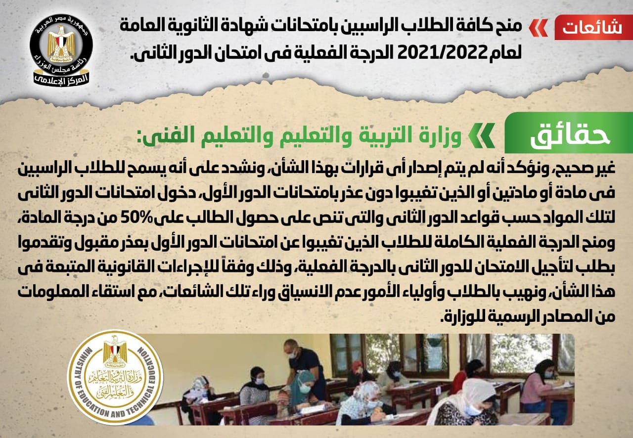 قام المركز الإعلامي لمجلس الوزراء بالتواصل مع وزارة التربية والتعليم والتعليم الفني، والتي نفت تلك الأنباء، مُؤكدةً أنه لا صحة لمنح كافة الطلاب الراسبين بامتحانات شهادة الثانوية العامة لعام 2021/2022 الدرجة الفعلية في امتحان الدور الثاني، وأنه لم يتم إصدار أي قرارات بهذا الشأن، مُشددةً على أنه يسمح للطلاب الراسبين في مادة أو مادتين أو الذين تغيبوا دون عذر بامتحانات الدور الأول، دخول امتحانات الدور الثاني لتلك المواد حسب قواعد الدور الثاني والتي تنص على حصول الطالب على 50% من درجة المادة، ومنح الدرجة الفعلية الكاملة للطلاب الذين تغيبوا عن امتحانات الدور الأول بعذر مقبول وتقدموا بطلب لتأجيل الامتحان للدور الثاني بالدرجة الفعلية، وذلك وفقاً للإجراءات القانونية المتبعة في هذا الشأن، مُهيبة بالطلاب وأولياء الأمور عدم الانسياق وراء تلك الشائعات، مع استقاء المعلومات من المصادر الرسمية للوزارة.