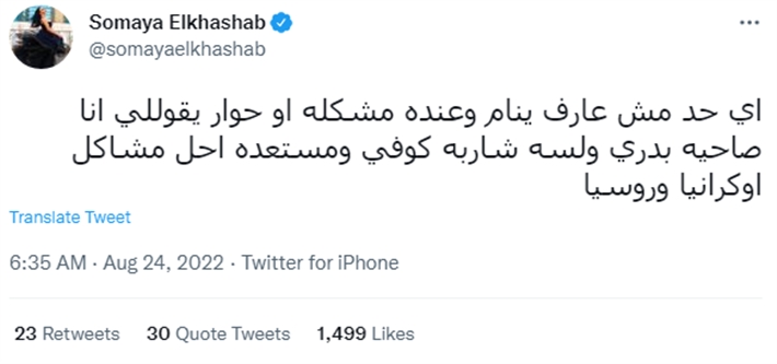 كتبت سمية الخشاب عبر حسابها بموقع التغريدات القصيرة: "اي حد مش عارف ينام وعنده مشكله او حوار يقوللي انا صاحيه بدري ولسه شاربه كوفي ومستعده احل مشاكل اوكرانيا وروسيا".