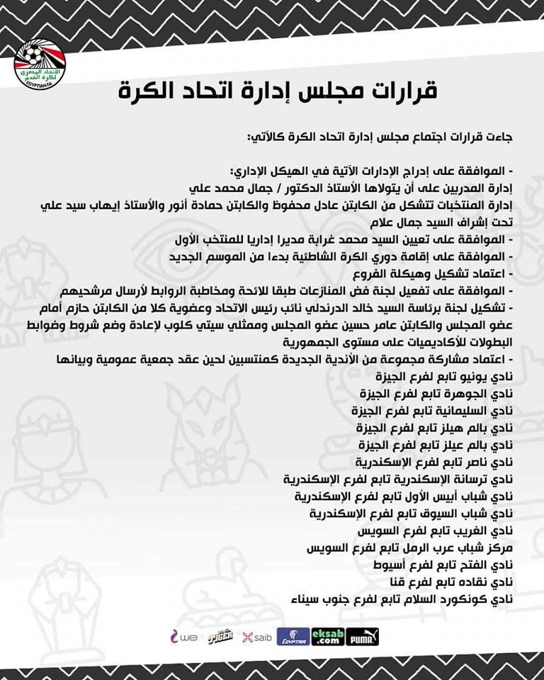 أسفر اجتماع مجلس إدارة الاتحاد المصري لكرة القدم عن مجموعة من القرارات الهامة، المتعلقة بكرة القدم المصرية، والتي جاءت كالتالي:
