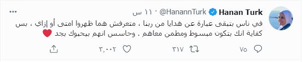 نشرت الفنانة حنان ترك تغريدة جديدة لها عبر حسابها الخاص علي "تويتر" ، وكتب قائلة:" في ناس بتبقى عبارة عن هدايا من ربنا، متعرفش هما ظهروا امتى أو إزاي، بس كفاية إنك بتكون مبسوط ومطمن معاهم وحاسس إنهم بيحبوك بجد".