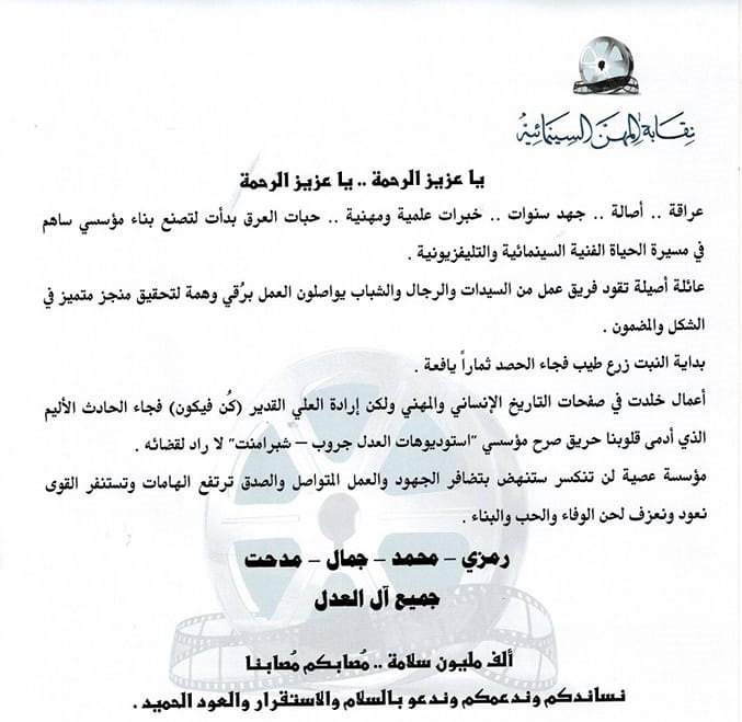 وتابع البيان: “عائلة أصيلة تقود فريق عمل من السيدات والرجال والشباب يواصلون العمل برقي وهمة لتحقيق منجز متميز في الشكل والمضمون، بداية النبت زرع طيب فجاء الحصد ثمارًا يافع، أعمال خلدت في صفحات التاريخ الإنساني والمهني ولكن إرادة العلي (كن فيكون) فجاء الحادث الأليم، الذي أدمى قلوبنا حريق صرح مؤسسي استوديوهات العدل جروب – شبرامنت لا راد لقضائه”.