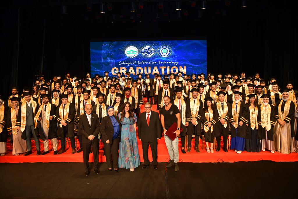 كرمت جامعة مصر للعلوم والتكنولوجيا النجمة درة، أثناء حفل تخرج دفعة جديدة من كلية "تكنولوجيا المعلومات"، حيث حرصت الفنانة على مشاركة الطلاب فرحتهم بالتخرج.