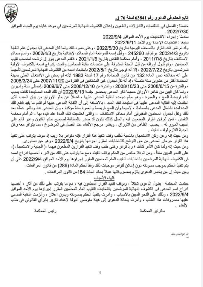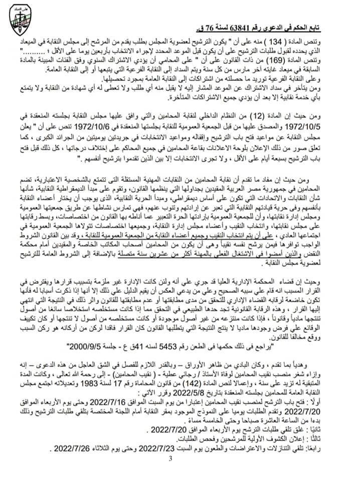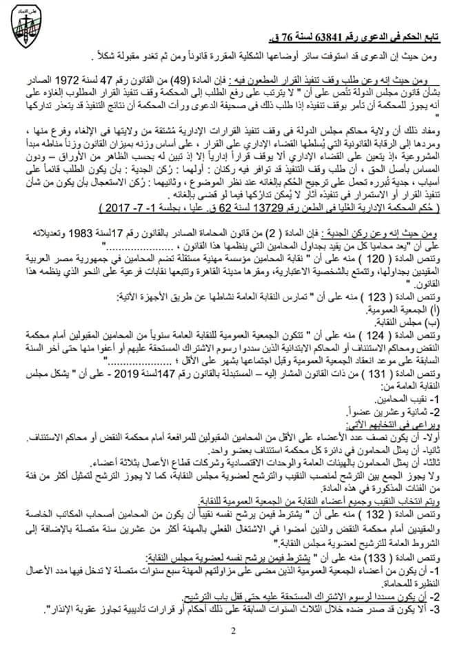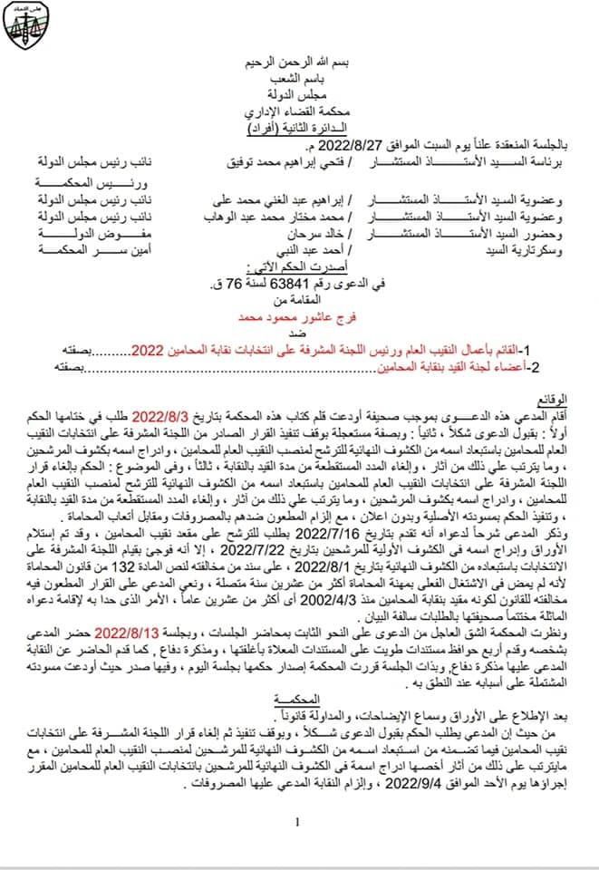 وفي وقت سابق قضت محكمة القضاء الإداري برئاسة المستشار فتحي إبراهيم توفيق نائب رئيس مجلس الدولة، بقبول الدعوى التي تطالب باستبعاد سامح عاشور، ومنتصر الزيات، من قائمة انتخابات نقابة المحاميين.