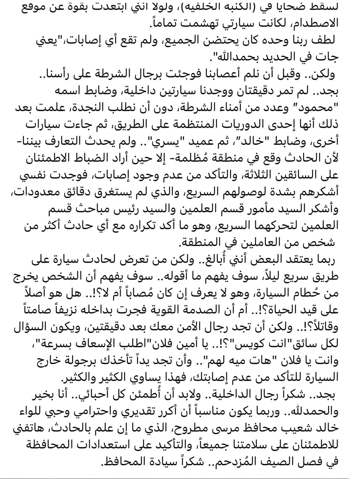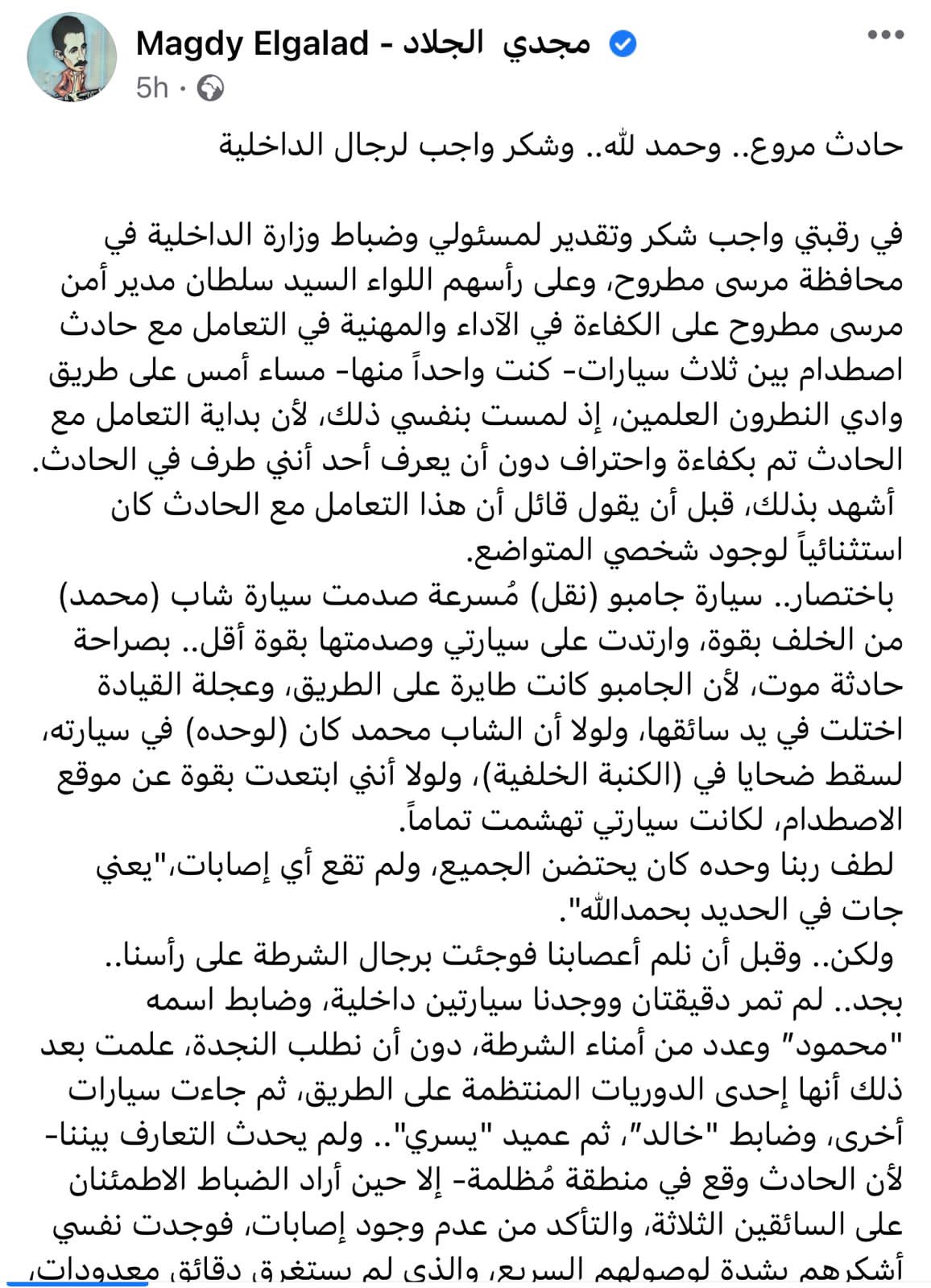 وقال الجلاد عبر صفحته الخاصة فيس بوك: حادث مروع وحمد لله وشكر واجب لرجال الداخلية في رقبتي واجب شكر وتقدير لمسئولي وضباط وزارة الداخلية في محافظة مرسى مطروح، وعلى رأسهم مدير أمن مرسى مطروح على الكفاءة في الأداء والمهنية في التعامل، مع حادث اصطدام بين ثلاث سيارات- كنت واحدًا منها- مساء أمس على طريق وادي النطرون العلمين.