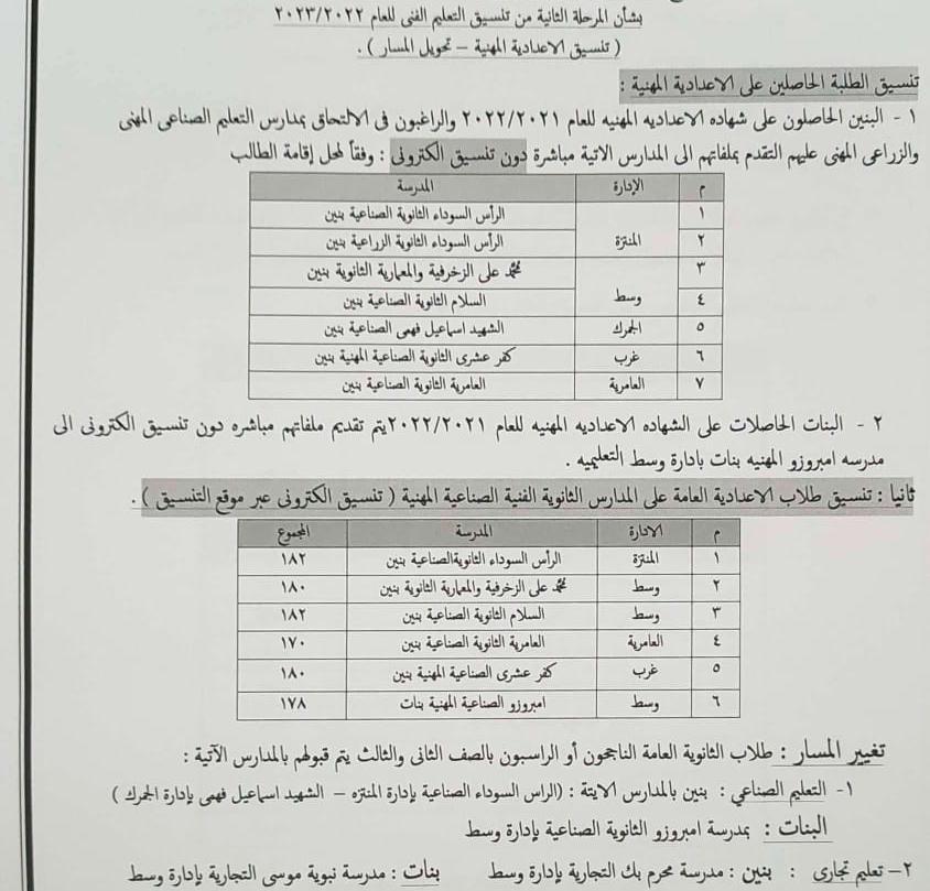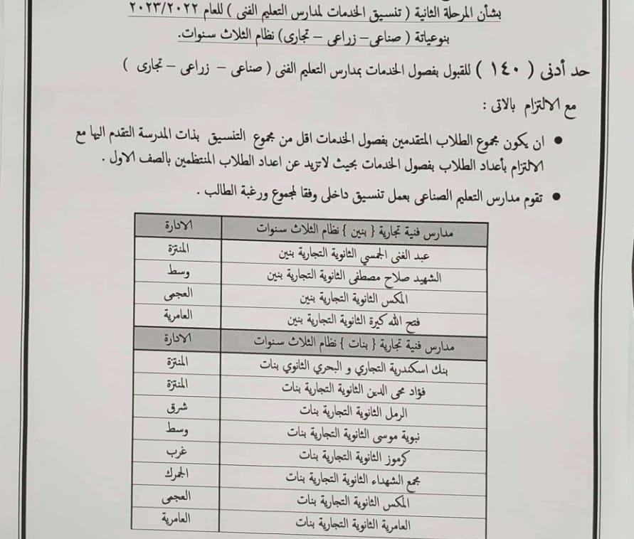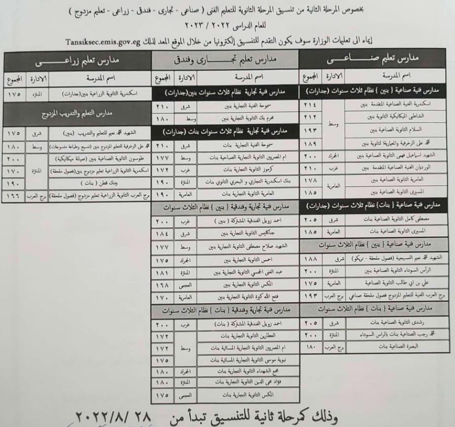 اعتمد اللواء محمد الشريف محافظ الإسكندرية، اليوم، تنسيق المرحلة الثانية للقبول بالصف الأول الثانوي لمدارس التعليم الفني بنوعياته (زراعي، صناعي ، تجاري ، فندقي ، مزدوج) للعام الدراسي 2022 / 2023.