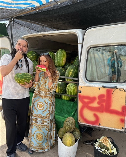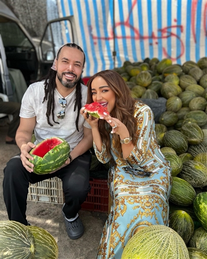 وظهر عبد الفتاح الجريني وزوجته في الصورتين وهما يأكلان البطيخ وتبدو عليهما علامات السعادة.