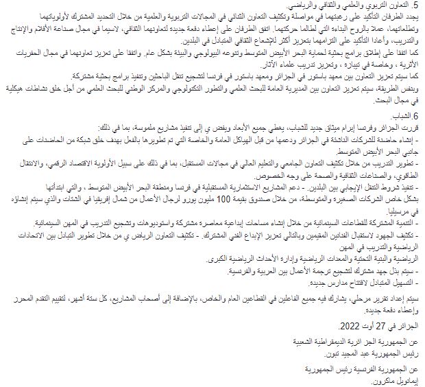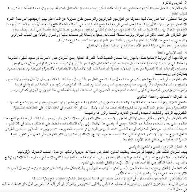 بعد ستين عامًا من استقلال الجزائر، وعملا بروح إعلاني الجزائر لعامي 2003 و 2012، فإن الجزائر وفرنسا، بناءً على العلاقات الإنسانية الاستثنائية التي توحدهما وعزمهما على تعزيز صداقتهما وترسيخ إنجازاتهما في مجال التعاون والشراكة، تجددان التزامهما بإدراج علاقاتهما في إطار ديناميكية من التقدم