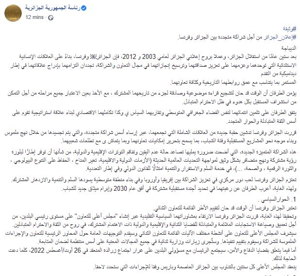 نشرت الصفحة الرسمية لرئاسة الجمهورية الجزائرية عبر موقع التواصل الاجتماعي “فيس بوك" وثيقة وقعها كلًا من الرئيس الجزائري عبد المجيد تبون، والرئيس الفرنسي إيمانويل ماكرون، والتي تم توقيعها خلال زيارة الرئيس الفرنسي للجزائر والتي استمرت لثلاث أيام اختتمها أمس بتوقيع تلك الوثيقة، قبل أن يقوم الرئيس الجزائري بتوديعه من مطار العاصمة الجزائرية هواري بمودين.