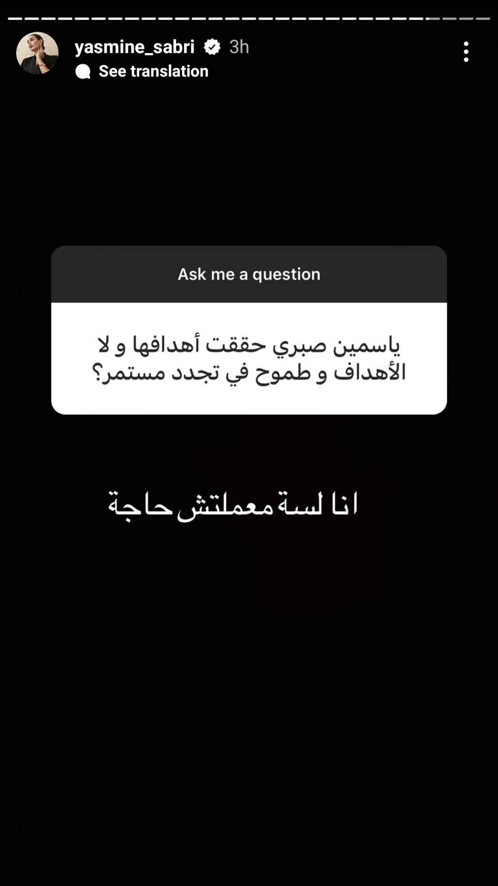 وردت ياسمين صبري على سؤال أحد متابعيها على صفحتها على إنستجرام من خلال خاصية الإستوري، جوبت على سؤال تحقيقها لأهدافها و طموحها في تجدد مستمر قائلة :" أنا لسه معملتش حاجه" .