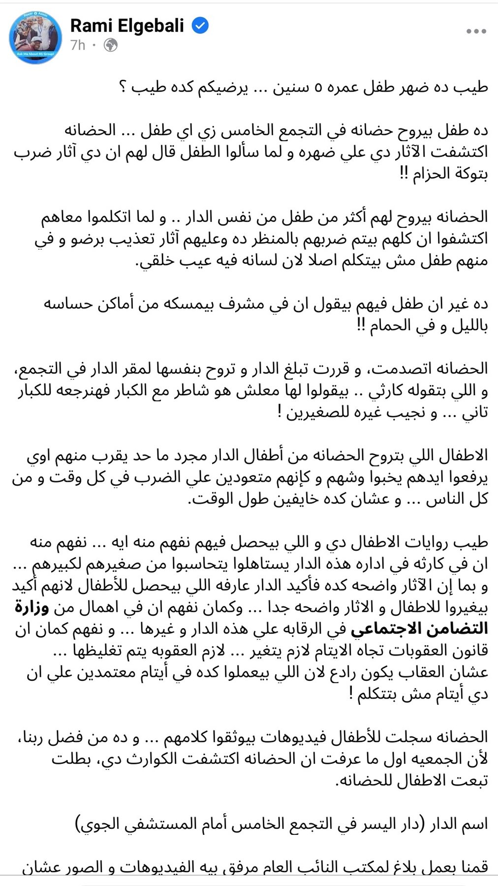 قال رامي الجبالي، مؤسس صفحة أطفال مفقودة، إن هناك طفل يعيش دار اليسر في بالتجمع الخامس عندما ذهب الي الحضانة مثل أي طفل اكتشفت الحضانة اثار الضرب علي ظهره وعندما تم سؤاله قال لهم سألوا دي آثار ضرب بتوكة الحزام. مشيراً إلى أن الحضانة يذهب لهم أكثر من طفل من نفس الدار وعندما تحدثوا معاهم اكتشفوا أن كلهم بيتم ضربهم بالمنظر ده وعليهم آثار تعذيب برضو وفي منهم طفل مش بيتكلم اصلا لان لسانه فيه عيب خلقي، وأيضا اشتكي طفل أنه يتعرض من مشرف في الدار ليمسكه من أماكن حساسة بالليل وفي الحمام.