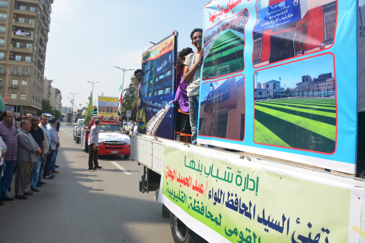 بدأ الاحتفال بمسيرة لسيارات تحمل أبرز إنجازات ومعالم محافظة القليوبية يتقدمها علم مصر يحمله أبناء المشروع القومي للموهبة والبطل الأوليمبى، وفريق الموسيقى النحاسية لطلائع القليوبية ، وفرق الجوالة رافعين الأعلام في مسيرة تشهد بإنجازات محافظة القليوبية.
