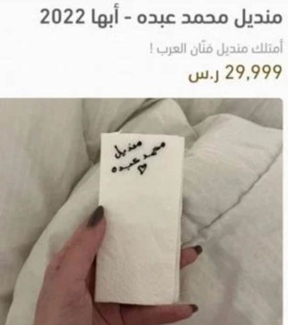 ضجت مواقع التواصل الإجتماعي بعد عرض منديل الفنان والملحن السعودي محمد عبده، الذي استخدمه في حفله الأخيرة بمدينة أبها للبيع بسعر خيالي فاق كل الحدود، وهو ما جعل الجمهور يتساءل عن سعر المنديل الحقيقي.