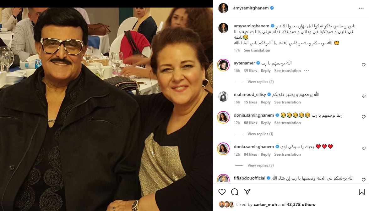 وشاركت إيمي سمير غانم صورة لوالديها الراحلين، عبر حسابها الخاص على "انستجرام"، وعلقت قائلة:" بابي و مامي بفكر فيكوا ليل نهار، بحبكوا للابد و في قلبي و صوتكوا في وداني و صورتكم قدام عيني وأنا صاحية و أنا نائمة الله يرحمكم و يصبر قلبي لغاية ما أشوفكم تاني إن شاء الله".