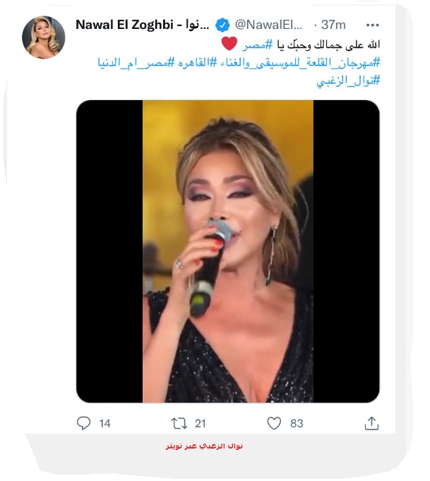 وتنشر نوال الزغبي يوميًا فيديوهات وصور عبر حسابها الخاص علي "تويتر" تعبر فيها عن حبها لوطنا الحبيب ، وعلقت قائلة: الله على جمال و حبك يا مصر، الله عليكي يا مصر".